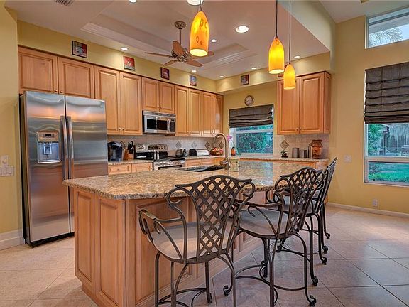 • Interior Features: Ceiling Fans(s), High Ceiling(s), Living Room/Dining Room Combo, Master Bedroom Downstairs, Crown Molding, Walk-In Closet(s), Skylight(s), Window Treatments, Open Floorplan, Eating Space In Kitchen, Kitchen/Family Room Combo, Wet Bar, Built in Features, Stone Counters, Tray Ceiling(s)