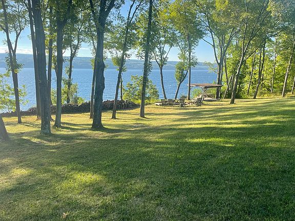 "The Pearl of Seneca Lake" As you weave through the wooded drive you come upon this custom built B & B home along Seneca Lake. Over 4,800 sq ft, 5 bedrooms, 5 1/2 baths, spacious kitchen has island with seating. Large dining area with a bay window looking over the lake. Living Rm with fireplace and doors to deck. 1st flr bdrm with bath. Owners have suite on 2 flr with bdrm, bath, sauna & den. All remaining bdrms have baths. Full basement. Walking trails throughout the gentle slope of 13 acres down to the house. Yard has firepit area looking over the lake. Steps to dock and 384' of lakefront.