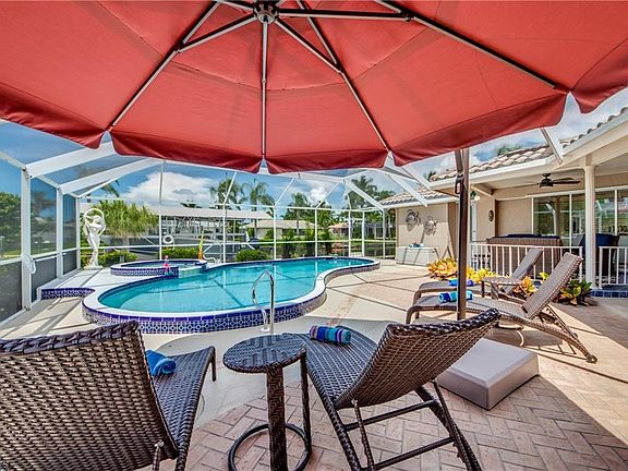 Seller has received offers and does not want any showings done anymore. Location! Location! Location. Remodeled and updated 4 bedrooms, 2.5 bathrooms Direct Gulf Access property with screened-in heated pool and spa. All assessments in and paid. Other new amenities include composite wooden captain's walk with wrap-around dock and 12000 pounds boat lift with cover, pool equipment remote controlled and newer AC system. Property has upgraded marble tile throughout with wooden floors in bedrooms. Open kitchen with breakfast bar, stainless steel appliances, 2 living rooms and wet bar. The covered lanai is located just off the kitchen and living area. Laundry in residence, 2 car garage with circular driveway. Property has always been well cared for. Furniture is negotiable.