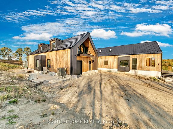 Discover the perfect blend of modern design and country serenity in this nearly new A-frame cedar farmhouse set on over 65 acres of picturesque agricultural land. This thoughtfully designed new custom built home balances warmth and sophistication through tasteful neutrals, elevated finishes, and exceptional craftsmanship. Expansive windows flood the open living spaces with natural light and frame sweeping views of the surrounding fields and woodlands. The sleek custom galley kitchen is equipped with built-in high-end appliances and leads seamlessly to a dining area with walkout access to a stunning glass-railed balcony complete with a covered section for year-round enjoyment.The property is bordered by open pastures, stretches of farmland, and the tranquil flow of Penville Creek meandering through the landscape. Beyond the nearly 3,400 sq. ft. of living space you will find an impressive three-door insulated garage. With heated concrete floors this workspace provides ample storage, plus an additional 1,100 sq. ft. partially finished loft above ideal for a studio, office, or guest suite. The permit and brand new services (well, spetic, hydro) can accomodate for a second dwelling, offering incredible potential for multi-generational living or future investment. Please refer to the attached schedule for a complete list of premium inclusions, too many to list here. This is countryside living reimagined modern, peaceful, and built for those who value quality, beauty, and space to breathe.