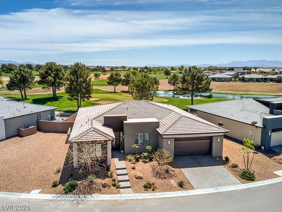 Stunning, absolutely breathtaking view & home! This William Lyon/Ovation build has clean lines, high-end upgrades, soaring ceilings, & one of the top lots in the neighborhood. Oversized covered patio looks to golf course and pond. Landscaping has been finished to perfection, the the view is serene. Open kitchen boasts lg island, breakfast bar, eating nook, butler's pantry, built-in double ovens, formal dining or open den, & easy access to patio through slider. Primary suite offers accent windows, wide walk-in shower, tub, dual sinks, walk-in closet, & views of the pond. Oversized 2-car garage with additional golf cart parking/storage space, smart irrigation, granite tops, tile flooring, & awesome curb appeal. Ovation is a gated 55+ community, within Mtn Falls, that offers a private clubhouse, heated pool, billiard lounge, full gym, shuffleboard, tennis courts, firepits, & fitness coach. In addition, Mtn Falls club has 3 pools, restaurant, 18-hole golf, & driving range! 45 min to LV!