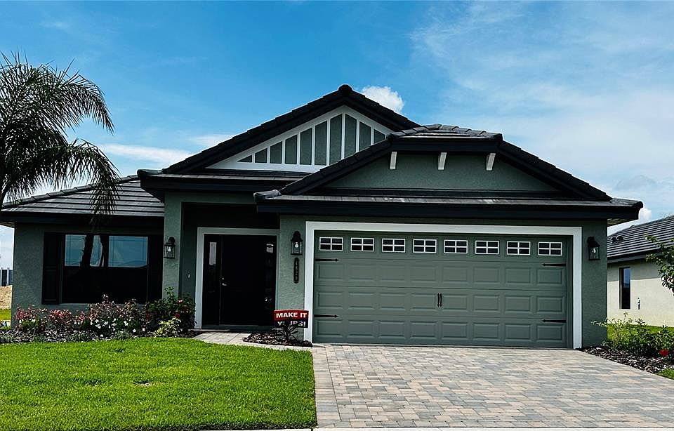 This 2200 Sq ft home has 4 bedrooms and 3 baths, 2 car garage, lots of entertaining space and luxurious details throughout! Upon entering you will enjoy the open concept great room/dining room/kitchen with 10’ ceilings, wood look plank tile in main areas, granite countertops throughout, 5 ¼ inch baseboards, wainscotting in dining room and much more. The owner suite is spacious with Tray Ceiling w/crown molding. Ensuite has double sink vanity with extra storage drawers, linen closet, tile separate shower w/glass door, nice tub, etc. The home also has a second owner suite with ensuite and a large walk-in closet. 2 other bedrooms in the home share a oversized bath with linen closet, tub-shower combo, separate toilet, double sink vanity with storage drawers. The exterior of the home has a tile roof and patio paver driveway, and patio paver covered lanai. This community is gated, has a gorgeous clubhouse with fitness center, pool overlooking the lake, basketball court, tennis court, playground, and community boat ramp. Photos are of a finished 2200 . Actual colors and finishes may vary. This is a must see home.