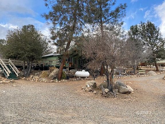 An Amazing Property with 2.5 acres in the heart of Kernville!! Lots of Privacy! Hear the roar of the Kern River and walk to town. The home has 1 bedroom and 1 full bath, with an area next to living room that was once another bedroom and can be again. Front door opens to a lovely screened in patio with amazing views. Nice open floor plan with large eat in kitchen, electric range and oven, side by side fridge, dishwasher. Living room has a large picture window with gorgeous views of the acreage and mountains - and the local wildlife!!! Rock fireplace with a propane insert. Newer vinyl dual pane windows, laminate floors. The downstairs garage is massive (county has it as a 5 car!). Impressive work bench with cabinets, 1/2 bath and store room (could have been a dark room once upon a time!). Laundry hookups and water heater are in garage as well. There is a large deck connecting the home with an unfinished studio. Finish the drywall inside and make it anything you want, art studio, media room, exercise room, craft room, etc. Circular driveway and water collection system. This is a beautiful piece of property with tons of trees! Perfect vacation spot or permanent home.