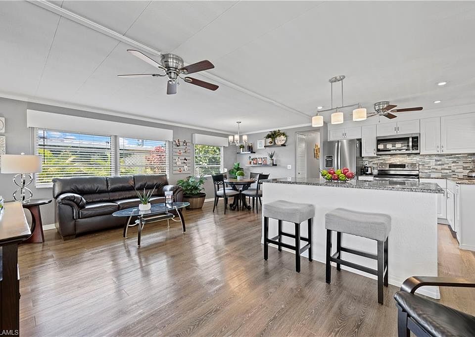 ***COMPLETELY UPDATED*** MODERN, DOUBLE WIDE **YOU OWN THE LAND*** Manufactured home like NO OTHER in sought after 55+ community of Riviera Colony! The newly updated kitchen has beautiful white cabinets, stainless steel appliances, kitchen island, granite throughout and modern tile back splash. A family room AND a great room! NEW plank flooring, 2 NEW Bathrooms completely updated and a bonus room that could be used as a den/office. There is a sprinkler system with a NEW pump for lawn irrigation that runs on a well. This home has 1396/sf of living area under air and another 220/sf of an enclosed lanai. A carport that encompasses both front and kitchen doors. A 12x20 attached air conditioned shed/workshop with laundry area and utility wash tub. Freshly painted. Paid exterior/interior extermination contract through June 2021. Manual Roll-Up Hurricane Shutters. Pets allowed with approval. Community features a clubhouse, pool, shuffleboard, bocce and many activities. Riviera Colony is one of the most affordable communities in Naples with low HOA fees! Located just five miles to beaches, restaurants and 5th Ave. Be sure to view the 3D tour and video!
