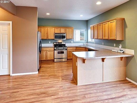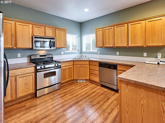 Popular West Hills home features great room concept & boasts 4 bedrooms, huge 2nd floor laundry incl. washer/dryer, generous living room with gas fireplace, and kitchen with breakfast bar. Flex room w/ french doors on main level could be formal dining room or office or??? Large fenced back yard, covered front porch, and oversized garage creates loads of living and storage areas both indoors and out.