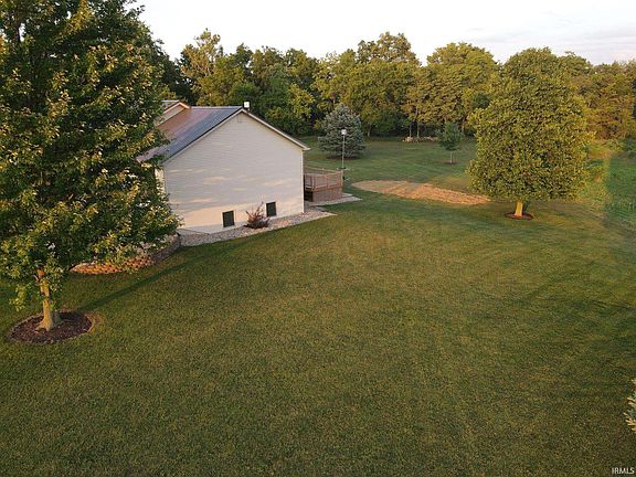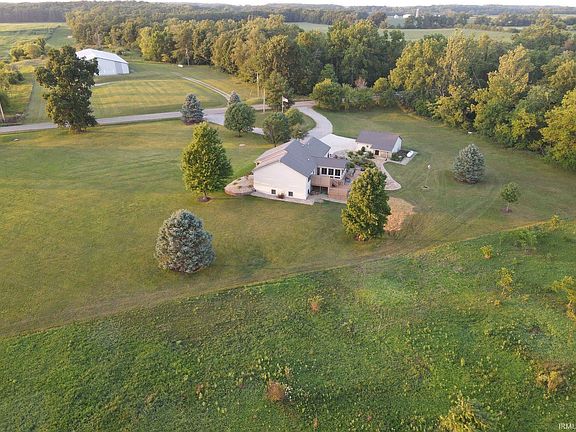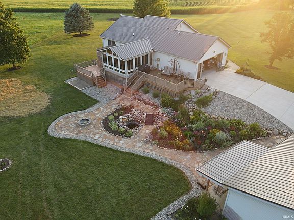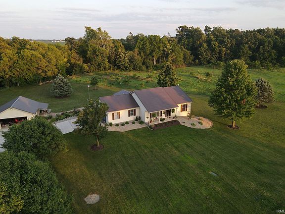 Contingent First Right. Still accepting offers! This beautiful 8+ acre property is bordered by Pigeon Creek on one side and is partially wooded for hunting. Enjoy the quiet of having only wildlife for neighbors. Best of all, you can enjoy the deer, turkey and other wildlife year around as well as watch the moon rise from the beautiful four season full glass sunroom overlooking the woods. Walk outside and enjoy the three decks on this home. One is set up to install a hot tub with a removable side railing and electrical service. Walk the path to enjoy the large, gorgeous perennial flower gardens and come to the firepit to sit and enjoy the quiet evening. There is also a 2nd detached garage with a porch and porch swing that overlooks the gardens. This ranch home sits on a full finished daylight basement with two bedrooms and two full baths upstairs and two bedrooms and a full bath down. The kitchen offers granite countertops and a 4' x 6' island with a built in wine refrigerator. Large pantry. Beautiful electric fireplace in the sunroom keeps it cozy in winter. There is also an electric fireplace in the lower level family room. Attached garage contains a wall of built in cabinets for extra storage; the floors have been poly coated in 2022. New garage doors/automatic openers were installed on both garages in 2022. The 85" TV downstairs is negotiable. Note that listing agent is also owner. Room sizes are approximate.