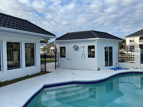 'CURRENTLY UNDER CONTRACT, SELLER ACCEPTING BACKUP OFFERS' Remarkable canal waterfront home in Bay Point with inground pool. Great open floorplan for entertaining.The newly painted kitchen and cabinets opens into a large living area with a fireplace and a lovely lanai that overlooks the water, pool and additional pool house that completes the space for outside entertaining. Tile and LVP flooring, granite countertops, freshly painted inside and out. There is a brand new roof on both the home and the pool house with Worthouse tile. New sliding doors in pool house. Large outside deck and seawall with dock with power for a yacht with 185 ft on the canal. Just a few minute boat ride or car ride to the beautiful Gulf of Mexico. Very close to the Thomas Dr. gate. This h
