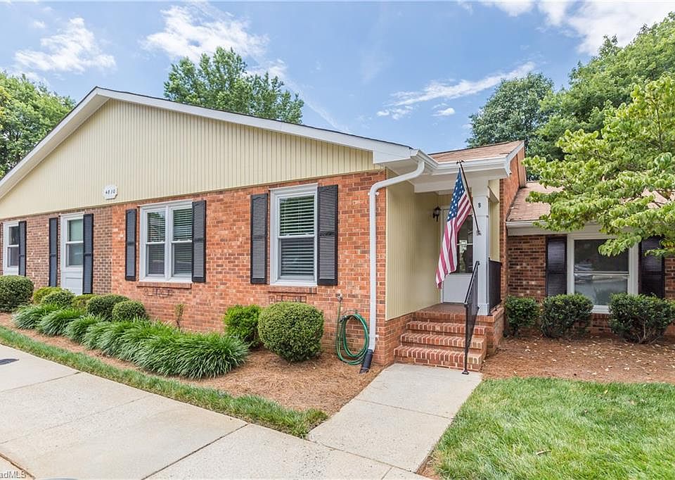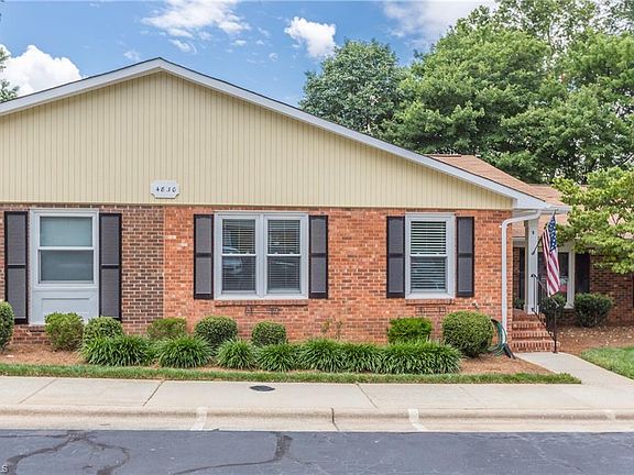 Easy living ONE LEVEL Townhome in Greensboro! 2 bed 2 bath with PRIVATE back patio and fresh paint throughout! All brick home with GRANITE counter tops in kitchen and a FIREPLACE in the living room that opens to the dining area! NEWER hot water heater, storm doors, lighting, windows, and roof!! Conveniently located minutes from shops and stores on W Market St. and a neighborhood pool included! This home will not last long!!