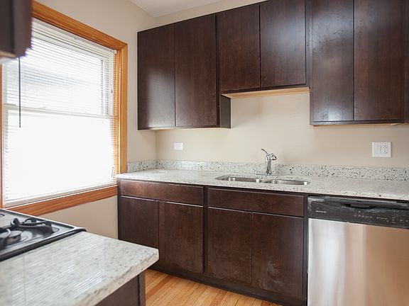 NEWER 2BDR 1 BTH APARTMENT FEATURING; NEW KITCHENS AND BATH, INCLUDING GRANITE C/TOP AND SS APPLIANCES REFINISHED HARDWOOD FLOORS BEAUTIFUL TRIM WORK AND DOORS SPACIOUS BEDROOMS WITH AMPLE CLOSET SPACE SEPERATE DINING AND LIVING ROOMS PRIVATE BACKYARD AND OPTIONAL GARAGE SPACE AVAILABLE FOR 75 PER MONTH CLOSE TO KIMBALL BROWN LINE STATION AVAILABLE IMMEDIATELY $300 move-in fee, responsible for all utilities except water and trash removal, must have good credit and rental history to apply.