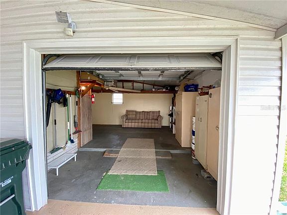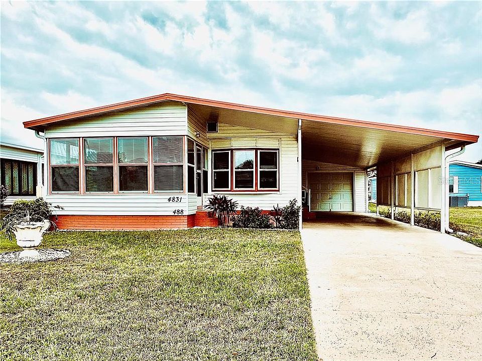 Location, Location, Location. This home is directly across from the clubhouse so you won't miss any activities; just walk across the street! This 2 Bedroom, 2 bath home has an oversized, two section garage, as well as a carport. The glass window Florida Room has been vented with the homes duct system, so it is under central heat and air and included in the square footage. You will love this room and enjoy the view! Home has double insulated windows, 3-year-old AC unit, privacy shield in the carport, replumbed, re-sided with vinyl siding, topped with a deep groove metal roof, laminate flooring installed in the living room and the hall. Both bedrooms have walk-in closets, hall closet, linen storage cabinet in the hall bathroom which also has tub/shower; master has shower. All appliances, including washer and dryer, and furniture is included in purchase. Fun activities and amenities in the clubhouse include heated pool and spa, along with water exercise classes; pickleball and shuffleboard courts, picnic pavillions on the lake and a walking trail around the lake. Library, commercial kitchen, large gathering room, exercise room. Low HOA fees and a healthy HOA, this community is located close to everything.