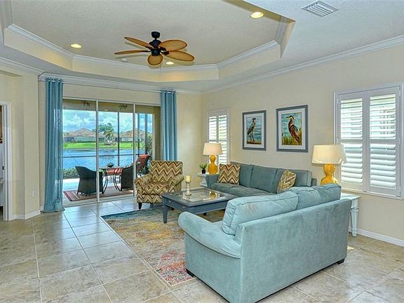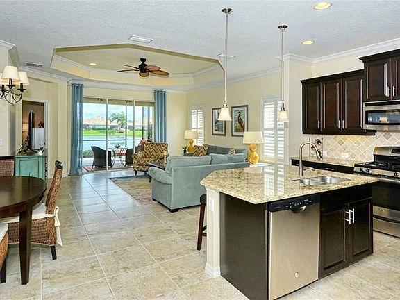 Gorgeous WATERFRONT home. Everyday living is a delight in this gently-used, like-new home. MOVE-IN READY villa in GATED community. Enjoy the WATER VIEW the moment you open the front door. CONTEMPORARY styling in a neutral palette can easily be personalized. GORGEOUS home with elegant finishes. Elegant GLASS FRONT ENTRY DOOR brings in extra light and creates that perfect welcome for your guests. NO CARPET - the same TILE throughout the entire home makes for a beautiful canvas for tasteful décor. TRAY CEILING with RECESSED LIGHTING in the Great Room. PLANTATION SHUTTERS in living room. Seller opted to add DOOR TO THE MASTER BATHROOM giving you the privacy you deserve - this is a DEFINITE UPGRADE; not included in basic floor plan. EXTENDED LANAI provides plenty of room for outdoor living. Split-bedroom plan. Basic Ground maintenance included in the low quarterly fee. Pool/Spa and Fitness Center - a pleasant stroll from this home. Convenient location with easy access to shopping and dining; a quick drive to UTC with all of its offerings; and just a bit further to all the beautiful beaches. Want an EASY MOVE??? Beautiful furnishings and contents for purchase at a very reasonable price. Ask for details. A great year-round residence or perfect winter home. Seller INCLUDING 1-YEAR Home Warranty for your Peace of Mind.