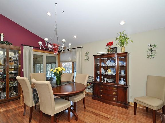 Single family condominium home located on a cul-de-sac in a quiet area with abundant wildlife. Great location for commuters. Large LR/DR rm features stone gas FP,vaulted ceiling,HW floor,music system,views of the woods. KIT offers custom cabinetry,granite,tile floor, dinette. Main floor master suite. Master bath w/whirlpool,lg shower w/multiple shower heads,dbl vanity. 1st floor office w/custom bookcase, moldings.3 season sunroom overlooks the woods & patio. LL has FR w/gas stone FP & surround/music & TV, walkout to patio,2 bedrooms,full bath. Furnace & AC for main floor are 2 yrs. old.