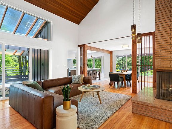 Beautifully remastered SW Hills mid-century modern stunner in ideal location! NEW roof,hardwoods,HVAC, perfect finishes & sleek Carrera marble kitchen, walnut cabinets & Miele/Bosch appliances.Walls of windows & glass doors bring nature in w/vaulted family rm w/double fireplace blending perfectly w/the period finishes.Main level owners suite & nearby bedrooms,upper level office, plus lower level w/potential ADU w/kitchenette. 4 entertaining decks & patio. Unincorp Mult County. Top rated schools!