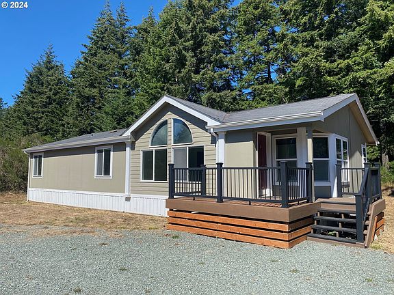 SUPER CLEAN & WELL MAINTAINED Bandon 2008 Skyline manufactured home on 1.42 acres with huge barn/detached garage, pasture & tons of parking, RV parking & flat useable land. Interior is lovely, not at all boring with architectural details & user friendly amenities like Palladian windows in the great room, luxury vinyl plank flooring, leathered granite countertops, stainless steel appliance, skylights, an additional dining area surrounded by windows, 2 bedrooms plus an office, a master suite, laundry room, newer Daikin heat pump, new well pump & water filtration, garage door opener for the detached garage in barn, one of many places to park in there. Call soon!