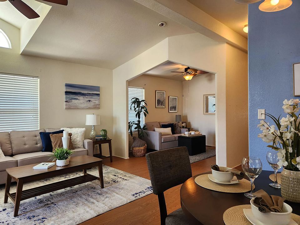 NO ELECTRIC BILL with the newly installed Solar Panels that are fully paid off. This Gorgeous Manufactured Home in The Cliffs, a 55+ community featuring 2 bedrooms and 2 full bath, vinyl wood plank flooring throughout with Soaring 9 foot ceilings, light and breezy with skylights and ceiling fans. Impressive dual pane windows throughout and east facing Woodward window brings in wonderful lighting. Enjoy cooking in this spacious, bright kitchen with Quartz counter tops and a custom butcher block section on the counter. There are custom paint on interior accent walls, stunning hardwood cabinets, pull knobs, GE stainless steel French door refrigerator, gas stove, BOSCH CUSTOM BLUE dishwasher, and countertop microwave all conveys. Laundry room offers overhead cabinetry and washer/dryer unit conveys. Primary bedroom with en-suite bathroom, walk in closet, and French doors opens into a lovely sunroom. Hall bathroom has tub/shower combo. Extra sitting area can be the perfect office/ 3rd bedroom if walled off. Efficient evaporative cooler on the roof top keeps this home cool during the hot days and stay warm in the winter months with the central furnace. This home is complete with the convenient tandem car parking spaces and conveniently located near by, are ample guest parking. This wonderful home has a low maintenance outdoor space with functional rosemary bushes for avid home cooks. The extra storage shed is perfect for seasonal decors or extra tools.