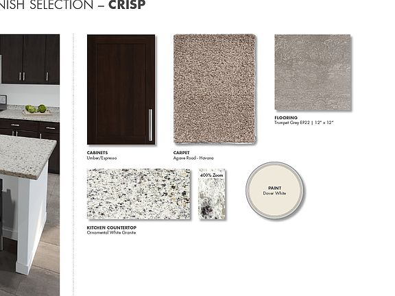 Watch the desert come to life from the covered patio just off the great room. Umber cabinets with cream/black granite countertops, Travertine-look tile flooring and warm grey carpet in our Crisp package.