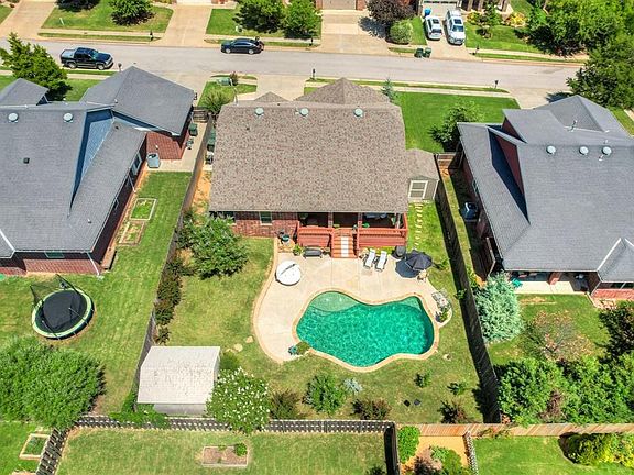 Wow! East Edmond with an incredibly nice concrete pool for under $400k (self-cleaning heated pool w/jets)! Open floor plan with beautiful hardwood floors, stunning kitchen with granite counters and split floor plan. You will find two secondary bedrooms that have a shared bath at the front of the home - one has wood floors and the other has brand new carpet. The primary bed is tucked away on the backside of home away from the other bedrooms and has brand new carpet and paint. The primary bath has double sinks, whirlpool tub, shower w/new glass door and walk-in closet. The big backyard has two Tuff sheds, one with electricity. Enjoy a spacious covered deck with a gas line for a grill. The home has a sprinkler and alarm system, plus a STORM SHELTER in the garage floor. Extended driveway and sidewalk to A/C pad in the fenced backyard. Conveniently located east of I-35 in Arbor Creek.