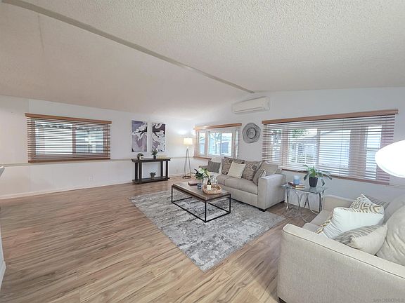 Manufactured home at The Cliffs: A 55+/21+ Community east of Mission Valley in Allied Garden. Enjoy comfort, convenience, and canyon views in this charming 1991 manufactured home located minutes from shops, restaurants, parks, and major highways. This move-in ready home features 2 bedrooms, 2 full baths, and a bonus private covered sunroom off the primary bedroom, great for plants, reading, or creating a cozy workspace. The living room, dining area, and hall have luxury vinyl plank flooring, and both bedrooms include soft carpet and remote-controlled ceiling fans. You’ll stay comfortable year-round with double-pane and bay windows, 2 mini split units system with heating and AC (1 in the living room and 1 in the primary bedroom), plus central heating throughout. The kitchen is bright and functional with a 5-burner gas stove, counter-depth stainless steel fridge, full-size dishwasher, and plenty of cabinet space. Vinyl flooring throughout and carpet in the 2 bedrooms. The indoor laundry room includes a full-size front-loading washer and gas dryer with extra storage. Step outside to a well-kept backyard filled with roses and greenery, along with two storage sheds for your tools and belongings. The 2 car tandem carport provides convenient parking, and guests parking are just around the corner. Tucked away in a quieter part of the community, away from the main clubhouse and pool, this home offers extra privacy while still giving you access to all The Cliffs amenities. The Cliffs has 2 Clubhouses: Main Clubhouse and Upper Clubhouse. Each has a kitchen, game room, library, and function room; billiards, ping pong, TV, and Wi-fi are also available. An outdoor heated swimming pool and spa are part of the Main Clubhouse complex. Also part of the Main Clubhouse complex are courts for shuffleboard and horseshoes, an unfenced area for dogs (25lbs or smaller), and an outdoor area suitable for parties and grilling (with your own grill). The Main Clubhouse can be reserved by residents for private parties. The Cliffs has a lending library of more than 2,000 books, audiobooks, DVD movies, puzzles, CDs, and even a few vinyl albums! The library collection is split between the Main and Upper Clubhouses. Space rent is $1721.48
