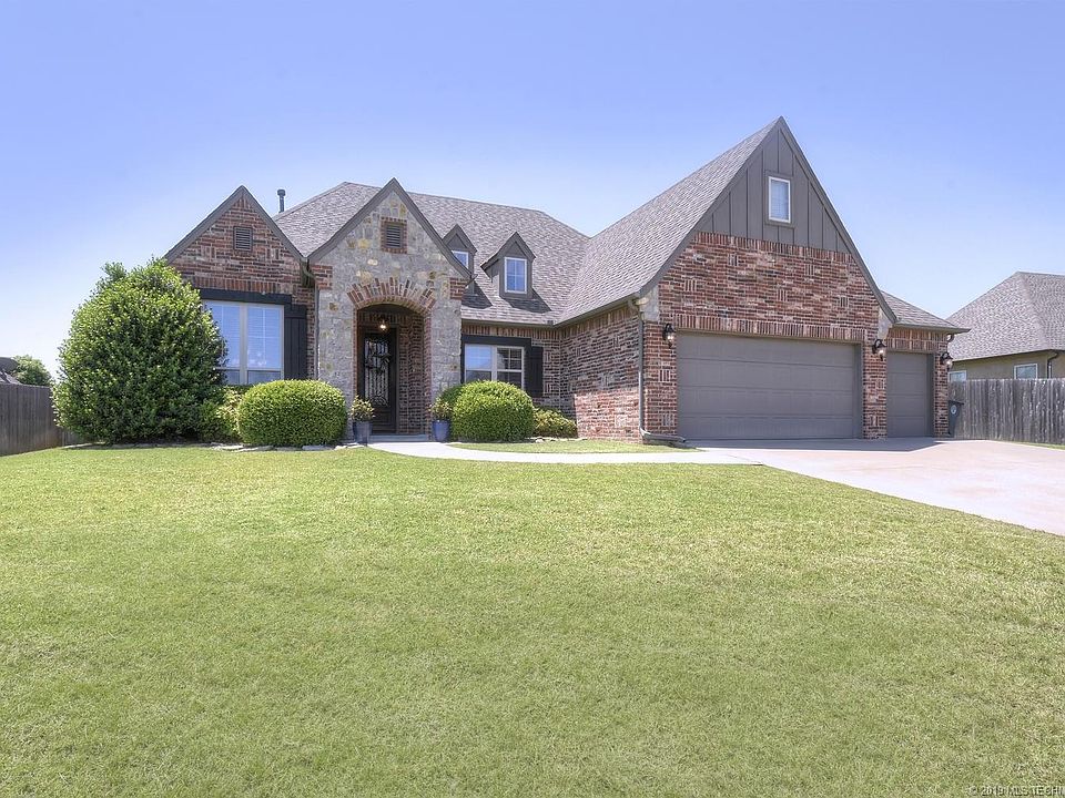 Stunning five bedroom home on over-sized lot in Broken Arrow school district! Open floor plan with 3 bedrooms, office & formal dining down. 2 bedrooms, full bath, & large game room up. Wonderful, entertaining backyard with outdoor kitchen, including built-in grill, granite, sink, and fireplace. 600+ square feet of outdoor living space, partially covered. Storm shelter in garage. Steps to neighborhood pool.