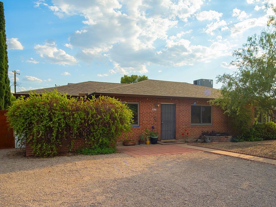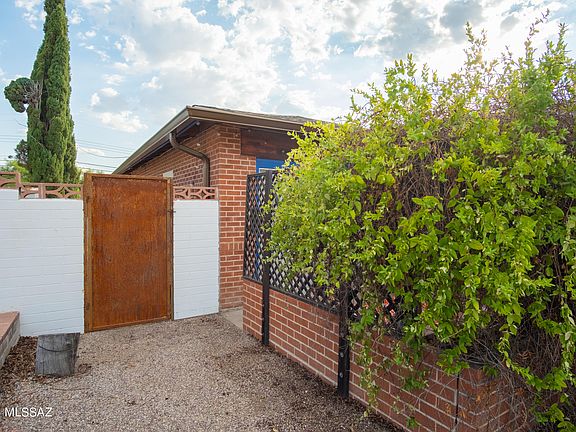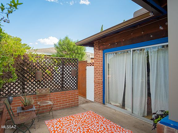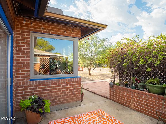 Welcome to this beautifully appointed 3-bedroom, 2-bathroom and a flex space home, offering 1,621 sq. ft. of comfortable living space. Centrally located for easy access to everything Tucson has to offer and across the street from a beautiful family park. The kitchen features granite countertops and stainless steel appliances, plank tile flooring in the dining and living area, concrete floors in the bedrooms, and Saltillo tile in the flex room which opens to front patio through sliding glass doors. There's a nice space for morning coffee of even outdoor meditation or movement!The spacious backyard is perfect for gatherings, featuring a storage unit, a small vegetable garden, and a unique mural painted by a local Tucson artist. Eco-friendly features include owned solar panels and an 1,100-gallon water harvesting system, making it perfect for sustainable living.