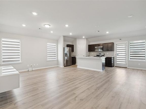The Bordeaux, an elegant one-story residence designed with modern living in mind. As you enter through the inviting foyer, you're welcomed into a contemporary, open-plan living space. The kitchen, equipped with stainless steel appliances, boasts a functional island and ample counter space, alongside a convenient pantry. This home features a generously sized primary bedroom suite complete with a walk-in closet. Additionally, there are two more bedrooms, a second full bathroom, and a utility room. The Bordeaux is finished with durable hard surface flooring and includes smart home technology for enhanced convenience and security