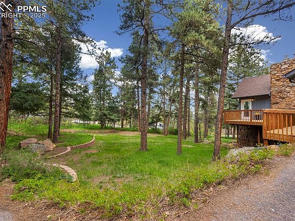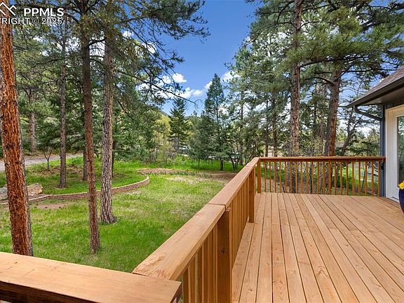 Nestled in the serene Red Rock Ranch neighborhood, this charming home sits on over 1.2 acres of treed beauty, just steps from Pike National Forest. Surrounded by towering ponderosa pines, scrub oak, and natural red rock & stone outcroppings, it offers a private, mountain retreat feel while remaining close to modern conveniences. Step onto the brand-new wood deck and into the inviting main-level living room featuring hardwood floors, a wood-burning stove, and abundant natural light from large picture windows and solar tubes. The spacious dining area accommodates a large table, while the cozy kitchen boasts some newer appliances and a custom pantry cabinet with pull-out shelving—ideal for organizing dry goods, oils, and spices. Down the hall, the primary suite offers newer carpet and trim, two walk-in closets, and an en-suite bathroom with extended vanity and soaking tub/shower. A second main-level bedroom also includes a walk-in closet and connects to the full bathroom with new custom vanity. The laundry room is spacious, featuring a window, utility sink, and extra storage. As you head downstairs, pause at the sunroom. It's an inviting retreat with cedar plank walls and new laminate flooring perfect for yoga, houseplants, or quiet relaxation. At the bottom of the charming staircase, the finished basement awaits complete with brand-new carpet and multiple walk-out entrances. The spacious family room features a wood stove with stone surround and is pre-wired for surround sound and pre-plumbed for a wet bar. An additional bedroom and full bath complete this lower level. Located in an established Monument neighborhood within the well-rated D38 school district, this home offers the perfect balance of mountain charm and modern convenience. If you’re looking for a peaceful escape with easy access to amenities, this is the place for you!