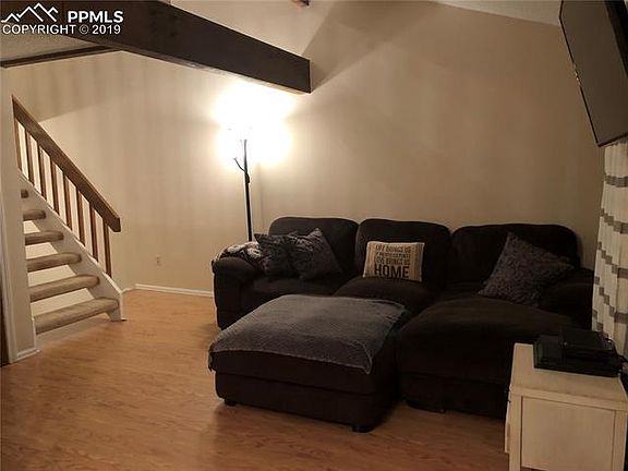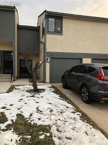 This is a beautifully well kept townhouse close to Powers and Austin Bluffs. It is open, bright and boasts wood laminate floors, wood beams for character, and an updated kitchen with granite counters, under mount sink, and stainless steal appliances. Sliding doors open from the dining area to a relaxing semi private concrete patio. Upstairs has a generous size master bedroom with walk-in closet and updated master bathroom with custom tile insets in the shower/tub. Newer vanity and lighting. Laundry is upstairs and the second bedroom is a loft with a large closet. Central air conditioning and extra storage in the garage. It is a unique find as it has a drive way and front yard! A MUST SEE! Offers in hand. Sellers are making a decision by 3 pm.