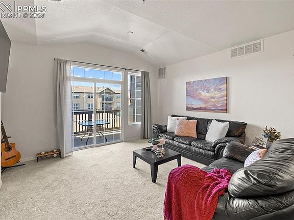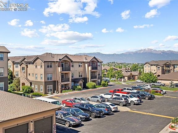 Welcome to your next home, nestled in this highly sought-after community. This is only the second three-bedroom unit to market in the last year. Start your day by enjoying a cup of coffee on your private balcony with a breathtaking, unobstructed view of Pikes Peak. Situated on the desirable 3rd level, this condo offers no neighbors above. As you enter your 9 foot and vaulted ceilings, you will feel the openness of the space. to the right you will see a large kitchen with an eat at the island. During the cooler months enjoy your evenings with your gas fireplace. This well-designed floor plan features three bedrooms and two full bathrooms and a large laundry room off the bedrooms for your convenience. The balcony is covered and offers a private storage closet. Don't miss the opportunity to make this your new home. With its prime location near Cottonwood Creek Park, shopping and dining schedule a showing today! Dont forget in the afternoons to visit your refreshing pool for those hot summer days.