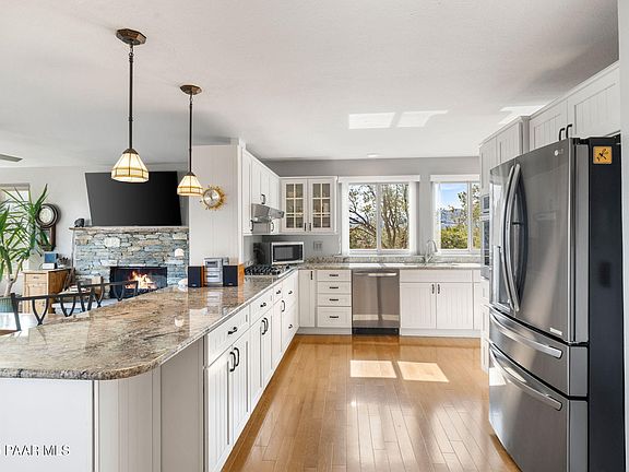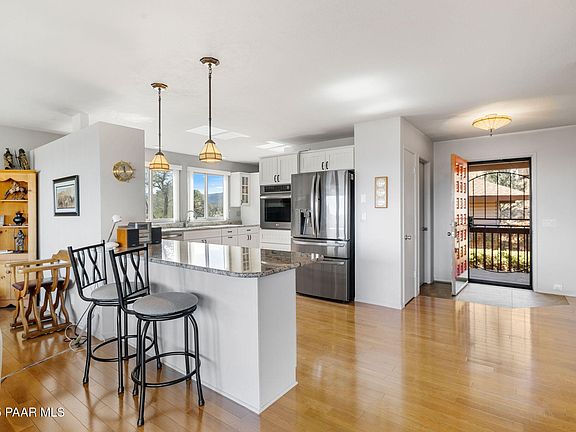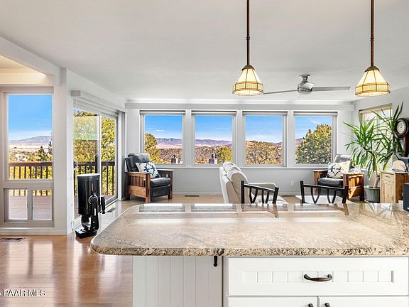 Breathtaking Mountain Views in highly sought after Yavapai Hills. Open concept main level living tastefully remodeled with the perfect blend of modern and mid century charm. Upgraded white kitchen includes gorgeous deep drawers, cooktop, cabinets with slides, stainless appliances with french door refrigerator and premium granite countertops. Adjacent great room has a cozy slate stack stone wood burning fireplace, floor to ceiling windows and deck faces easterly for incredible views of sunrise over Mingus Mountains and keeps you cool in the summer evenings for moonrise. Main floor living includes a large master ensuite with the same gorgeous views, oversized flex room that could be an additional bedroom/hobby/craft space or family room for the kids, and additional powder room for>>''more''