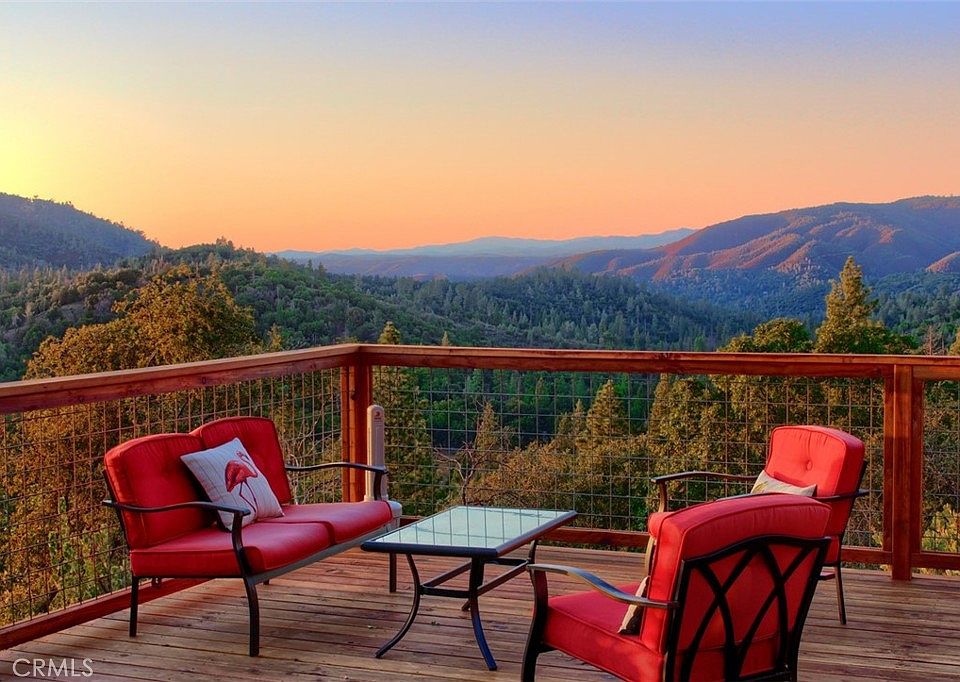 Nestled in the serene hills of Mariposa, this enchanting home, surrounded by the beauty of nature, beckons with a circular driveway and over 5 acres of secluded bliss, offering panoramic mountain views that paint the backdrop of your everyday life. The open-concept kitchen becomes the heart of this abode, providing not only culinary convenience but also a perfect setting for entertaining, seamlessly connecting to the living room adorned with a wood stove, beautiful wood floors, and expansive windows that invite the outdoors in. Head out onto the covered porch with oversized deck space and hot tub to an ideal spot for relishing summer nights in the cool mountain air.