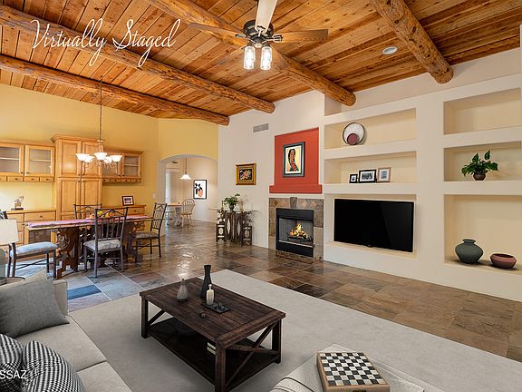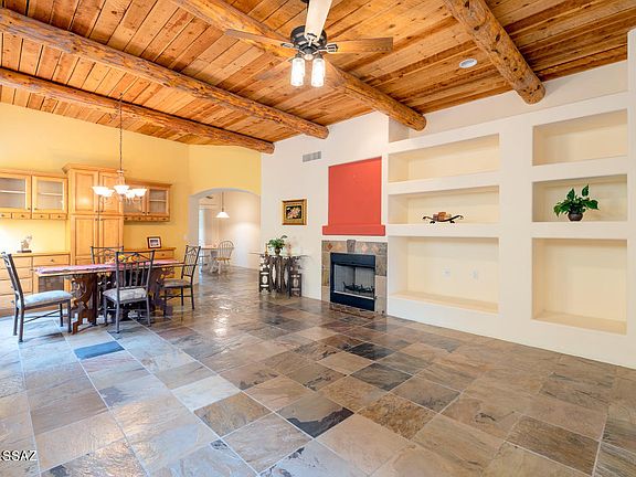 * Enjoy all the amenities in this former model home tucked away on a cul de sac lot. Chock full of upgrades: slate floors, stunning peeled log and plank ceiling in living/dining great room. Lots of niches and plant shelves, quality solid wood cabinetry throughout. Flagstone pathways and mature landscaping create charm and ambiance front and back. Spacious den/home office is a great flex room. New Trane AC(2016). Great location: convenient to Palamino Plaza, fine dining, shopping, the River Walk, and Ft. Lowell park is an easy drive.