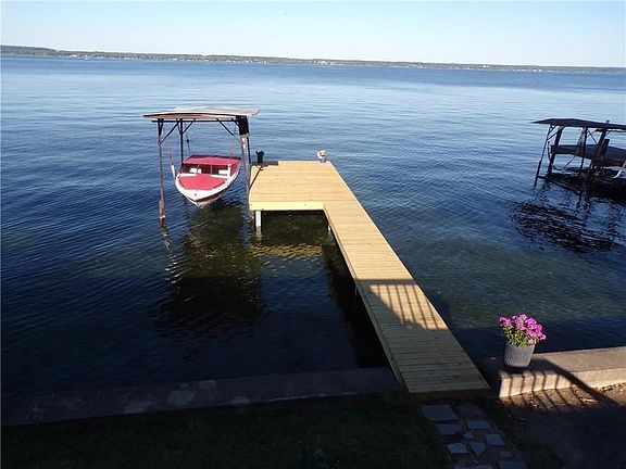 Seneca Lake Beauty -this LAKE front home has been transformed into the most tastefully designed places on the lake. The open floor plan allows view of the lake from every room w/glass sliding doors along lakeside throughout. New "vogue" kitchen w/quartz counters, ss appliances, tiled backsplash, gorgeous fixtures & breakfast counter leading into open living room & formal dining area with lake views surrounding you & full length decking on lake side! 1st floor full bath w/dbl. vanity, walk in tiled shower tastefully crafted, bedroom on main floor freshly painted. Lower lake level floor features 31' Master bedroom w/seating area, walk-in closet & a wall of doors leading out to lake with Brand New Dock. Full bath on this level w/river rock radiant floors, 3rd carpeted bedroom & laundry facilities. Utility room & extra storage. Plenty of parking with 36x66 driveway. This state of the art home has it all- newer roof, electric, floors, baths, kitchen, roof, dock, paved driveway & more!