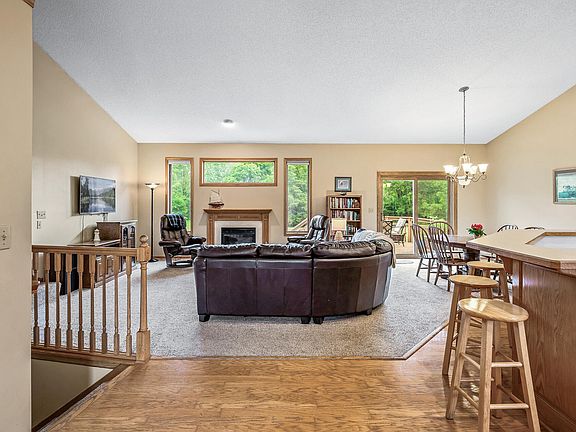 Beautiful custom, highly desired, Timber River Estates 5BR/3BA/3Car Insulated Garage, 4 Level Home on park-like 1 acre lot. Sip your morning coffee on the front porch swing or gather family and friends in the open, vaulted main level great room with natural light, gas fireplace, gourmet kitchen, 12 foot island bar top. Deck off the dining area for more outdoor gathering space. Main Floor Laundry with huge closet. Primary Bedroom with Walk In Closet and Private bath along with 2 other spacious bedrooms & an additional bathroom on the Upper Level. Expansive Lower Level Family Room with 3/4 bath and Walk/Out-providing space for entertaining, kitchenette, home theater, rec room and/or home office. 2 more large bedrooms with 2 storage rooms in the lowest level. *New SS Kitchen appliances in 2023. Trails and park within Timber River Estates. Close to Rum River Regional Park, trails, Rum River, restaurants, shopping and major roads.