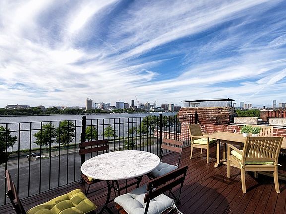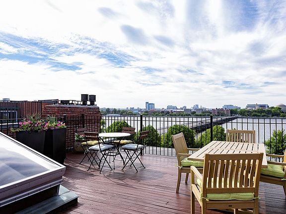 Sophisticated Waterside Beacon St residence features sunlight streaming from the Charles River, through to the City skyline, via bay windows on the front and rear facades. With three well-appointed Ensuite Bedrooms & an open concept living space, this two-level Penthouse duplex condo w/direct-keyed elevator lives like a single family private residence and is remarkably quiet. Master BR suite, walk in closet, Carrera marble dual vanity, soaking tub & shower. 3rd BR perfect as Home Office,Gym, Au Pair/Guest BR/Nursery. Elegant proportions, 10' ceilings, 3 gas fireplaces, crown molding, extensive storage & gleaming Brazilian Cherry Wood Floors. Both spacious outdoor areas - the balcony terrace off the dining area & the SPECTACULAR rooftop with 360 degree views - are exclusive; and include gas grills & plenty of room for seating & furniture.BRAND NEW Central AC & high end appliances.11 Spacious CLOSETS & 3 Deeded PARKING SPACES.
