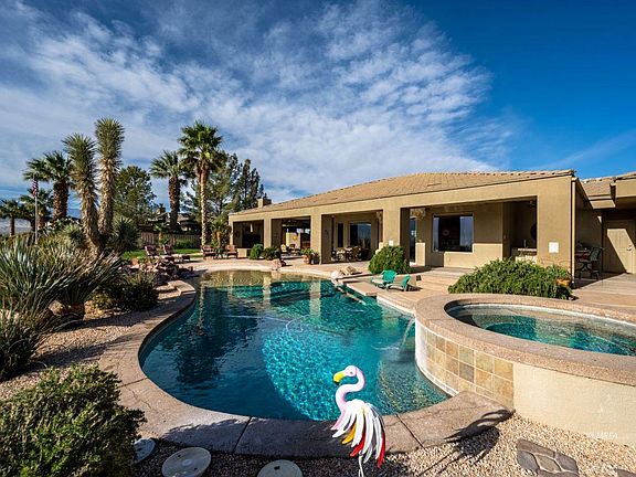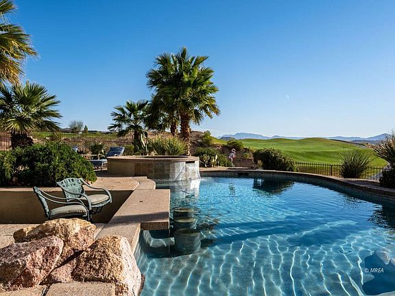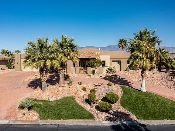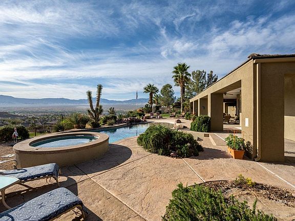 Fall in love with the majestic views of our city as well as love this enchanting Home! Magnificent street appeal with circular drive plenty of parking space for guests. Welcoming courtyard greets you with the serene sound of water bubbling down a rock fountain. Through leaded glass entry doors, you'll enjoy an open concept design, complimented by coffered ceilings & broad windows that immerse you in a breathtaking view extending to the beautiful Virgin Mountains creating a perfect entertainment space. This stunning home includes a casita with kitchette and private bath! Knotty Alder cabinets, granite countertops, tiled backsplash, Wolf appliances, walk-in pantry, bar-top seating & stone flooring create a 5 star experience for the chef! The outdoor space is simply stunning; beautiful swimming pool with beach entry, bar seating and a hot tub. If one hot tub wasn't enough, there is a Hot tub/water feature and shower in the main Bedroom Suite. Steps away is a full step down Bar, ideal for entertaining! Massive covered patio with fireplace, big screen, mister system, builtin kitchen and bar. Live Life atop Mesquite. Golf Gated community on Falcon Ridge Golf Course.