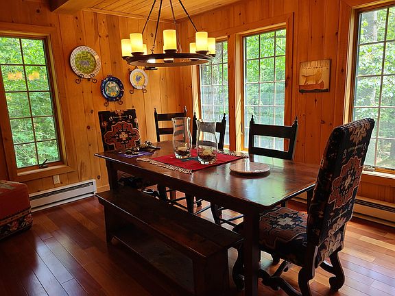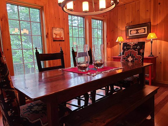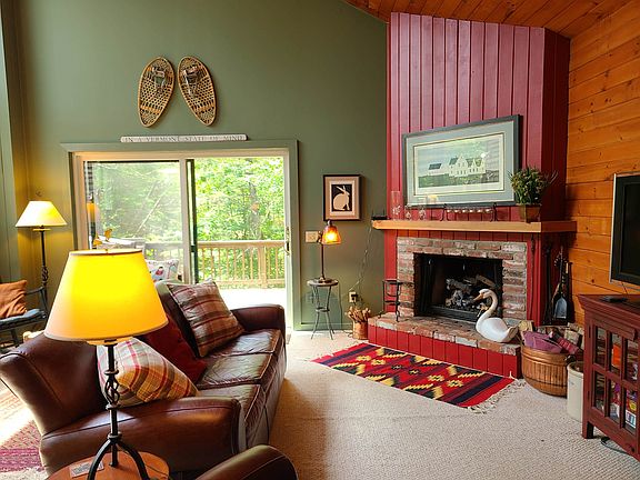 Charming 2 bedrooms PLUS sleeping loft, sunroom/den, lovely dining room, open living area with vaulted ceiling, upgraded gas fireplace in 2023, lots of windows and access to spacious deck. Lower deck off sunroom. New kitchen appliances, countertop, sink, faucet, backsplash. Laundry off walk-in pantry. Cedar siding redone 7 years ago along with new dining room addition and shingle roof. Metal roof redone in 2021. Open space for gardens/pots, plantings. House sited nicely back from road down lovely, wooded drive. Five minutes to Bromley ski area, 10 min to Magic Mt, and 15 min to Stratton Mt. Also, 10-12 minutes to shopping, restaurants, & events in Manchester. Being offered fully furnished.