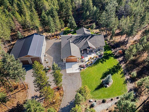 Nestled in the desirable Quail Ridge Estates of Spirit Lake, this stunning single-level custom Craftsman home offers 2,132 sq. ft. of refined living space on 5 beautifully wooded acres, minutes away from over 2,600 acres of accessible state land. Featuring 3 bedrooms and 2.5 bathrooms, this property blends luxury and comfort. The gourmet kitchen showcases granite countertops, rich black walnut cabinetry, and a spacious island with seating, perfect for entertaining. The open-concept great room boasts vaulted ceilings, a European-style freestanding wood stove, and striking custom rock accents. Retreat to the elegant master suite, complete with a luxurious tiled walk-in shower and a relaxing soaking tub. High-end finishes throughout the home include solid core doors, LVP flooring, and custom solid alder trim. The property also offers a fully insulated 30x50 shop with a newly added 14x50 lean-to, providing ample storage for your RV or boat. Enjoy seamless connectivity with high-speed Starlink internet, and take full advantage of the outdoor spaces. The home features a covered front porch, stamped concrete walkways, a large covered composite deck, and a fully landscaped yard with a 7-zone irrigation system. Experience peace, privacy, and unparalleled craftsmanship in this exceptional Spirit Lake home. Be sure to check out the 3D Matterport!