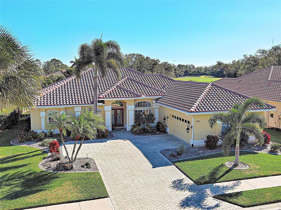 Welcome to this exquisite 3-bedroom + office, 3-bathroom, over-sized 2 car garage POOL home in the desirable gated, golfing (optional) community of Sawgrass! Set on large lot with mesmerizing water and golf views, this property dazzles with $115,000 in recent upgrades to include a NEW TILE ROOF and gutters (2025), pebble tech pool resurfacing, and a clear view screen in the lanai so you can fully enjoy the stunning views. As you approach, the fresh exterior paint, paver driveway, professional landscaping, side entry garage and double lead glass doors welcome you with undeniable curb appeal. Inside, the open floor plan with over 2600 feet of luxurious living space has soaring 12-foot ceilings, crown molding, classy diagonal tiles and the wall of sliders and many windows flood the home with natural light. Rest easy knowing the entire home has hurricane protection, garage door is hurricane rated, home is not in a flood zone, roof warranty is transferable, and the pebble tech pool surface has a lifetime warranty. This gorgeous home comes furnished for the buyer's convenience - just move right in! Create a delicious meal in the generously sized kitchen which offers newer appliances, roomy breakfast bar, sunny breakfast area, undercabinet lighting and pantry. Sleep well in the spacious primary suite which boasts 2 walk-in closets, sliders to the lanai and an ensuite bathroom with Roman walk-in shower, garden tub, dual vanities and private commode. The split floorplan with guest suite offers 2 spacious bedrooms, one with an ensuite bathroom and easy access to the pool/lanai area and the dual zone AC ensures everyone is comfortable. Relax or entertain in your private paradise with tranquil water views, a soothing waterfall feature and lush tropical landscaping, while floating in the pool - a true oasis. More to love: additional room in the garage has AC, the over-sized garage has a workbench and ample storage, lanai cage has stainless steel screws and lanai slider's rollers were just replaced. Sawgrass offers a vibrant lifestyle with wonderful amenities, including a resort style community pool, fitness center, active clubhouse and pickleball courts with low HOA fees and no CDD fee. Ideally located - just 4 miles from Venice Island’s beaches, dining, and cultural offerings, this home is also conveniently close to Sarasota Memorial Hospital, I-75, and the expanding Wellen Park community. Don’t miss this rare opportunity for luxury, location, and lifestyle - this spectacular home truly has it all! Be sure to watch the video.