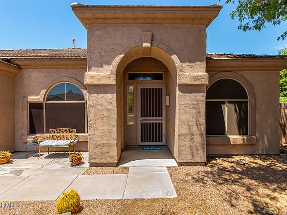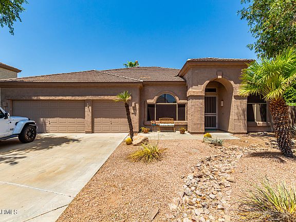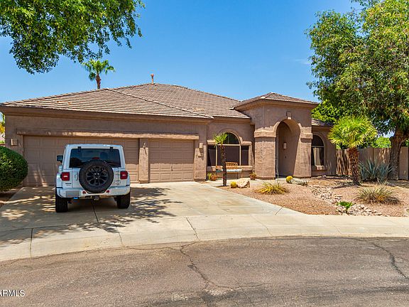 Become the proud owner of this gorgeous 3-bed, 2.5-bath residence in a tranquil cul-de-sac lot in Chandler. The captivating interior features tile floors, plantation shutters in all the right windows, a living room, & a formal dining room boasting a lively color scheme. Versatile den/office. Spacious great room offers wall niches & a cozy fireplace, excellent for gatherings. The kitchen is a chef's delight, complete w/ample white cabinets w/crown Moulding, a tile backsplash, SS appliances, granite counters, a large island w/a breakfast bar, & a breakfast nook w/a bay window. The primary retreat includes a sitting area & an ensuite w/dual sinks, a garden tub, & a walk-in closet. Finally, the lovely backyard flaunts lush greenery, a covered patio, seating areas, & a shimmering pool. Property on an oversized Lot. This is a perfect home for making new memories and savoring life's everyday moments!