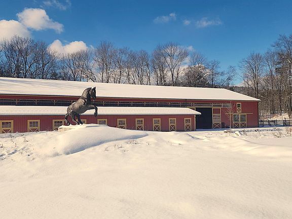 SHOOTING STAR FARM is a private, fully equipped horse facility on 57± acres of open turnout and protective woodland. Purpose-built for breeding and training, it offers turnkey infrastructure and serenity for serious equestrian pursuits—without sacrificing the creature comforts of home. The 1984 chalet-style house is sited for pasture and pond views, with a sunlit chef’s kitchen overlooking the red barn’s activity. The main floor also includes an open, spacious living area w/access to a 3-season porch and deck, for warm-weather relaxation; 2 Bedrooms, and a full bath complete this level. Upstairs, find a restful primary BR with luxurious custom bath. The walk-out lower level features 4 rooms, laundry, a wood stove, and a 2-car garage. For the horses, the 1980s breeding barn has 12 stalls, a wash stall, and a heated feed/lab/tack room, and the centerpiece of the farm is a like-new facility with14 stalls, indoor arena, a lovely galley kitchen, ¾ bath with laundry, and a big office upstairs, both levels with mini splits. Additional amenities include a stunning granite patio w/firepit, outdoor arena, multiple paddocks, hay storage, equipment lean-tos, and ample trailer/staff/guest parking. Off-farm riding includes miles of dirt roads and access to 13,000-acre Pisgah State Park w/62 miles of trails. Shooting Star is more than a farm—it’s a lifestyle investment for those who value privacy, purpose, and the quiet satisfaction of working with horses in a setting that inspires.
