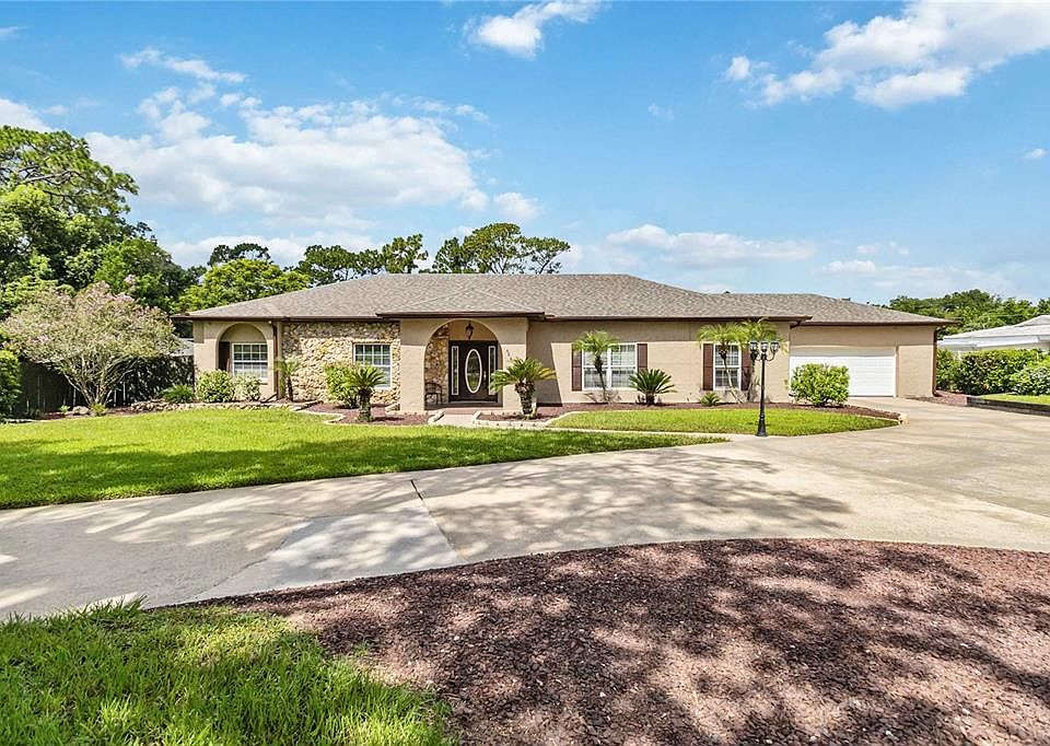 BACK ON THE MARKET!! Come see the renovations in your new home in a central location in Longwood, across the street from the old golf course, which will continue to be green space. It is like a 6-BEDROOM, 4-BATHROOM HOUSE with three bedrooms and 2 bathrooms to the left side of the house with an office space that can be used as a bedroom, and two rooms that could be used as IN-LAW SUITES since they both have their own private entrances and bathrooms. Approach the home with their circular driveway, well-manicured yard and big drive space. Inside the home, there is a living room with an electric fireplace to the right and an office through French Doors to the left, which can also be used as an extra bedroom. Each of the bedrooms in the main part of the house has large walk-in closets for lots of storage. The Florida Room off the back can be used as a Game Room with a mini kitchen and private bathroom, or as a possible IN-LAW SUITE. The front room off the garage can be used as an office since it has it's own entrance and bathroom, or as an extra bedroom. TILE FLOORS throughout. Vaulted ceilings. Garage converted back to a 2 car garage with washer/dryer hookups both in the garage and in the room off the kitchen. Extra parking along the back fence from the back road and provides access to large backyard - perfect for parking personal recreational vehicles. Roof, Plumbing 2022. A/C 2024. Septic pumped out and checked 2024.