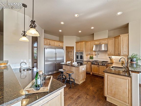 Welcome to this stunning 5 bed, 3 bath home nestled in the highly sought-after school district 38. Boasting breathtaking Pikes Peak views and high-end Viking appliances, this property offers a truly unparalleled living experience. As you step inside, you are greeted by an inviting and spacious floor plan that seamlessly blends elegance and functionality. The main level features a gourmet kitchen with high-end Viking appliances, perfect for culinary enthusiasts and entertainers alike. Prepare meals with ease while enjoying the views that surround you. The kitchen effortlessly flows into the dining area, as well as has easy access to the stunning deck, creating the perfect space gatherings and dinner parties. The master suite is a sanctuary of relaxation, complete with a private ensuite bathroom and a large walk-in closet. Wake up to Pikes Peak each morning, providing tranquility and inspiration. The main level is completed with an additional bedroom, full bath, and a spacious office with stunning built-ins. The basement provides the ultimate entertainment experience equipped with a wet bar and a spacious lounge area, this space is ideal for hosting unforgettable gatherings. Three large bedrooms, and a full bathroom, are the perfect completion to the lower level area. The exterior of this home is just as impressive as the interior. Step outside to a meticulously landscaped backyard oasis, offering a peaceful retreat. Whether you're sipping your morning coffee on the patio or hosting a summer barbecue, the stunning views of Pikes Peak and the Air Force Academy will serve as a breathtaking backdrop. Located within the highly acclaimed school district 38, this property offers access to exceptional education options. Additionally, the proximity to the Air Force Academy provides unique opportunities for those affiliated with or interested in the military. Don't miss the chance to make this extraordinary property your forever home.
