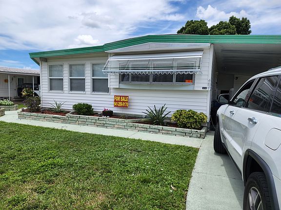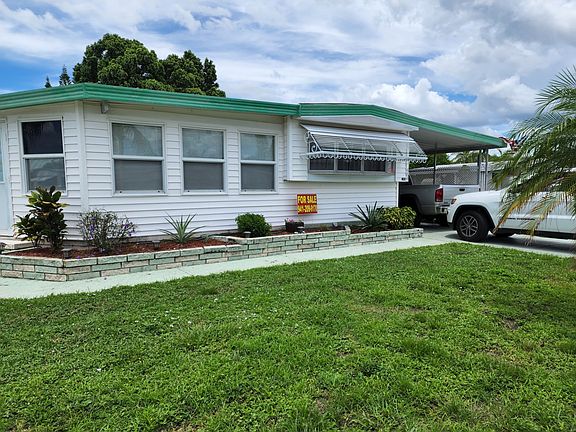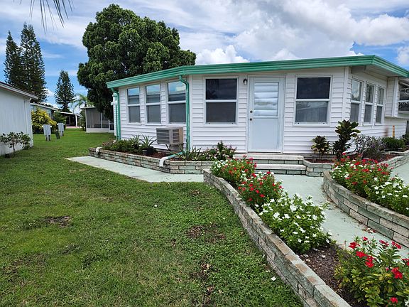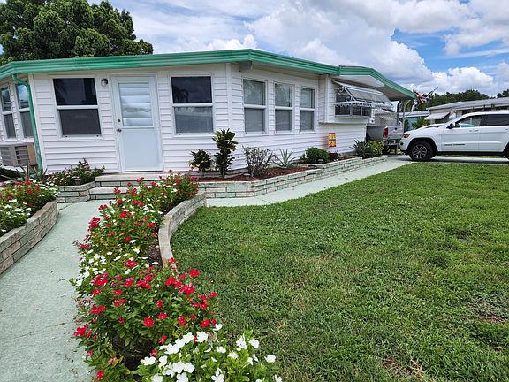 Wow!, Wow!, Wow! Introducing this beautiful immaculate home located on a corner plot surrounded by a kaleidoscope of lovely colorful flowers. This home has tremendous updates and is a must-see for sure. There are 3 bedrooms and 2 bathrooms and it offers a stainless steel refrigerator that is approximately 1 year old, a range that is 1 year old, a dishwasher that is 2 years old, and brand new garbage disposal. The washer and dryer are 2 years old. There are all new cabinets in the kitchen and a new island built with a tile top and cabinets, A new backsplash adds a lovely touch, all new lighting and all new light switches and new drywall has been installed, See the list online of updates. The Living room is an open floor plan and the floors where needed have new subfloors with laminate flooring throughout. The floors were installed 1 year ago and are waterproof. The Florida room is closed in and is a perfect place to relax. The ceilings are paneled, the walls are drywall and wood-paneled, and there are window treatments. A laundry room and a pantry are also available, this home has everything including a metal roof that was resealed one month ago, an attached storage shed, and a good-sized driveway and carport. It comes partially furnished and the lot rent is 908.86 and includes water, trash, lawn care, and sewer. Located in Colony Cove, this great park offers 6 clubhouses, 6 pools, a boat dock, and a dog park since it is pet friendly and accepts 2 pets up to 75 pounds. There are libraries, laundry facilities, billiards, shuffleboard courts, and a game room and there is a pavilion as well where you can fish, and grill out and it has an exceptional view. This park is close to Restaurants, medical buildings, shopping plazas, airports, and our beautiful Florida Beaches. Feel free to call me to view this home, this may be your dream home. I know as you tour this with me you will be pleasantly surprised at what you see, this home is immaculate like I said with a lot of upgrades. I will be delighted to show it to you. All listing information is deemed reliable but not guaranteed and should be independently verified through personal inspection by appropriate professionals. Integrity Mobile Home Sales cannot guarantee or warrant the accuracy of this information, measurements, or condition of any property. Measurements are approximate. Lot rent is subject to change.