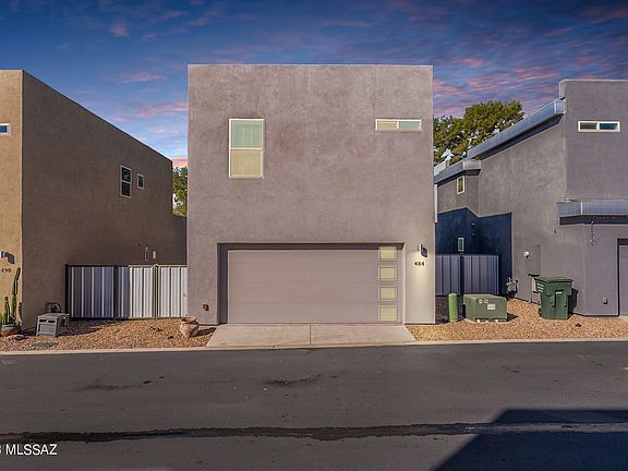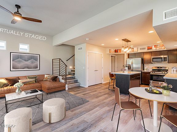 Amazing opportunity for modern, move in ready 2 bed/2.5 bath plus den/loft 1,363 SqFt, 2019 Pepper Viner built modern TEP guarantee energy efficient home on low maintenance Tucson R-3 lot with attached finished 446 SqFt post tension garage, priced below the ''Zestimate'', located in desirable Camino Modern. Featuring: E/W orientation providing daily Catalina mountain views, located at back of quiet subdivision, community sidewalks, ample guest parking, metal corrugated gated side yard with always green artificial grass and pavers. Inside buyers will be greeted with tall painted ceilings (no popcorn), energy efficient double pane windows, luxury vinyl plank flooring throughout (even the stairs, there is no carpet!), custom white plantation shutters, Pex plumbing, wood propeller ceiling throughout (even the stairs, there is no carpet!), custom white plantation shutters, Pex plumbing, wood propeller ceiling fan over the spacious living room adjacent to open concept kitchen with recessed LED lighting, full slab quartz countertops, kitchen island with bar seating included, chocolate mahogany modern kitchen cabinets, stainless steel appliance package with dishwasher, built-in microwave, refrigerator with water/ice dispenser, gas stove, garbage disposal, garden window, large closet pantry, downstairs bathroom and garage to kitchen access. Upstairs you will find loft/den area with closet storage, internal laundry room with washer and dryer (gas option) included, two generous bedrooms each with modern ceiling fans and private bathrooms. First bedroom has mountain views, quartz countertop chocolate mahogany vanity and shower/tub. Second primary bedroom has matching quartz countertop dual sink chocolate mahogany vanity with glass walk-in shower. The attached 446 SqFt finished post tension garage comes with heavy duty metal storage rack. The $65 monthly HOA includes street maintenance, common area maintenance, small community park and rentals are allowed (CC&Rs are under documents in MLS). Fantastic East Tucson location, walk to Jesse Owens public park with baseball and soccer fields, Jeff's Pub & Grill, Bowlero bowling alley, groceries, shopping and restaurants, minutes away from the famed Tucson Loop (access off Pantano), a 137 mile connected paved jogging/biking path and a short drive from Davis Monthan Air Force Base, Northwest Medical and Raytheon.