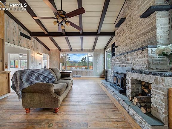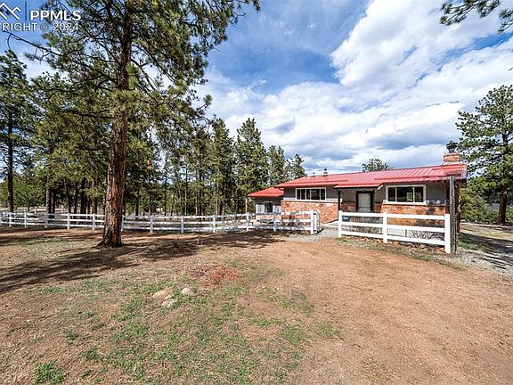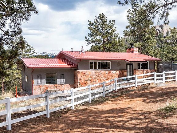 Escape to your Rocky Mountain paradise. Situated on almost 12 acres of Florissant's finest land, this property offers breathtaking views of Dog Head Rock and Pike's Peak that only get more spectacular as you approach the home. Enter through the gated circle drive and discover a haven of natural beauty with towering pines, lush grass, and fenced areas perfect for your four-legged friends. The lower 9.81 acres feature trails, massive rocks, old-growth pines, and even a creek, offering endless opportunities for exploration and adventure. Step inside the charming 3-bedroom, 2-bathroom rancher, which has undergone tasteful remodeling over the last three years. A Dutch door welcomes you into the spacious Great Room with vaulted ceilings and expansive windows that frame sweeping views of Dog Head, Pike's Peak, and the surrounding landscape. The home exudes rustic charm with random-width oak floors, patina ship lap, tongue-and-groove walls, and rough cedar trim. The kitchen has been fully upgraded with butcher block counters, satin white cabinets, and a farmhouse sink, while unique touches like copper detail and exposed brick add character. Relax in the sunroom and soak in the spectacular views, or retreat to the gigantic primary bedroom with an en-suite bath, laundry, and access to the fenced yard and deck. Outside, a new 320 square foot deck provides the perfect spot for outdoor entertaining. Additional features include a wood stove with blower, New water pressure pump at the home, New wiring, New Double Pane Windows, Radon system, Metal roof, and RV parking. With no HOA, a domestic well, and county-maintained roads, this property offers the perfect blend of privacy and convenience. Experience the wonders of nature with visits from bears, foxes, deer, elk, eagles, hummingbirds, and countless other birds. This is a once-in-a-lifetime opportunity to own a rare gem in the Rockies. Don't miss out— make this mountain retreat your own.