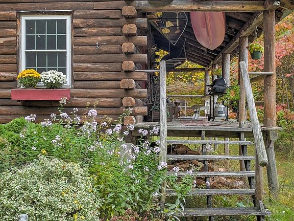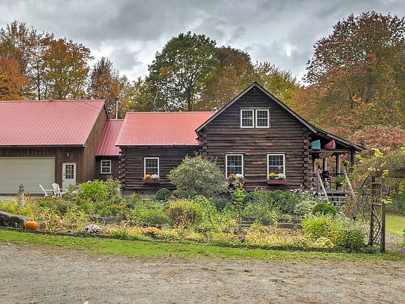What could be more romantic than going over a historic covered bridge and through the woods to your own log cabin? If you are looking for a cozy retreat to get away from it all you need to see this one of a kind custom home. Sited on gentle land with your own Christmas trees growing below the home and perennial gardens in front you will enjoy the beauty of all the seasons. Enter in to the sunroom with cathedral ceiling and sliders to the locust wood deck. This is a great place to view all the wildlife moving through the back yard. A shipshape cooks kitchen with gas range, and granite and tile countertops, and Kholer double sink will keep you and your guests happy. A Crawford wood cookstove will allow you to hone your woodfired cooking skills. Lovely local woods and exposed beams grace the walls and floors wrapping you in natural beauty. Envision time in front of the fireplace, with a cozy cuppa. The primary suite on the 2nd floor has walk-in closet and 3/4 tiled bath. Plus 2 more adorable bedrooms. There is a huge bonus room over the garage which has many possibilities. Fine quality throughout with attention to detail. Offered for a limited time only!