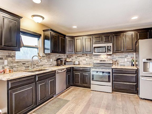 WOW! Beautiful home with brick front, a big covered porch and a 3 car garage extra wide driveway. 4 bedroom up stairs and 2 full baths. Large masters offers a stand up shower with tile. A large walk in closet and in ans a big bonus room. Utility room is on 2nd floor. There are also 3 other bedrooms up stairs. Kitchen offers updated cabinets, granite counter tops, and beautiful stone back splash. Kitchen floors are engineer hand-scraped hardwood.That opens to the Family room. Beautiful kidney shaped patio out back. The storage shed can stay or go, along with the play equipment. The yard is all vinyl fenced. Full basement, 1/2 finished with a kitchenette. Will give carpet allowance. On the other side is a man's dream workshop. You must check this out! Washer/ Dryer and all appliances stay.