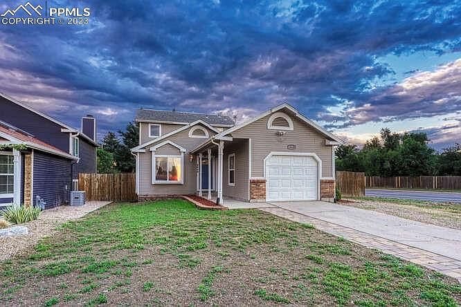 You'll enjoy the versatile floor plan in this beautiful 4BR, 3BA, 2-story home situated on a 0.14 acre corner lot! Keyless entry & security system provides peace of mind. Central air & heat & a SMART home thermostat offers year round comfort. As you step inside this home, you're greeted w/ vaulted ceilings & attractive wood laminate floors throughout much of the Main Level. The Entry leads into a Living Rm w/ a bay window that brings in abundant natural light & is a great place to entertain. It flows into the Dining Area & Kitchen that have tile floors & a slider out to the large backyard. The Kitchen features a pantry, abundant cabinetry w/ granite look countertops for storage & easy food prep. Appliances include a smooth top range oven, built-in microwave, a dishwasher & French door refrigerator. 2 Bedrooms on the main floor (1 is currently being used as an office) share a full hall bathroom that features a vanity, mirror, & tiled tub/shower. The upper level hosts a private Owner's Suite w/ wood laminate floor, a Full Bathroom w/ tile floor, dual sink vanities, a linen closet, tiled tub/shower & walk in closet w/ built-in shelves. The Basement offers under stair storage, a Utility Rm w/ a washer and dryer that stay, & Family Rm w/ lighted ceiling fan & neutral carpet. There is an additional Bedroom & Shower Bathroom w/ vanity, mirror, & tiled shower, perfect privacy for guests, in-laws, or even a teen suite. The fenced backyard provides a covered paver patio for outdoor dining & relaxation. 1-car attached garage. Radon Mitigation System. Close to schools, parks, and restaurants along the Powers Corridor. Near Peterson AFB! Don't miss the opportunity to make this delightful home your own.
