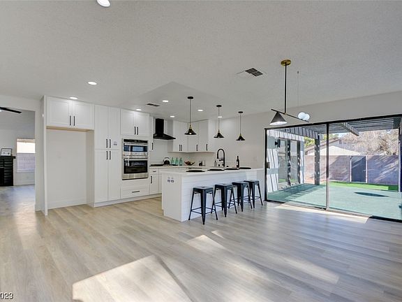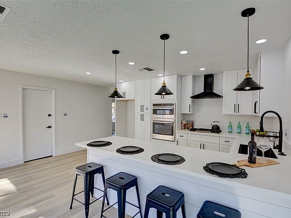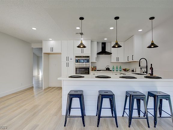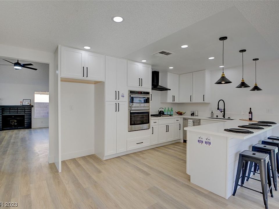 *THIS IS IT* Look no further than this IMMACULATELY REMODELED SINGLE STORY masterpiece UNDER $400K! Nestled in a convenient neighborhood, this home immediately welcomes you with STUNNING CURB APPEAL! Walk in and you are greeted with DESIGNER LUXURY VINYL PLANK FLOORING, 5 INCH BASEBOARDS, BRAND NEW CARPET, & INTERIOR/EXTERIOR PAINT! The VAULTED CEILING living room boasts a GAS FIREPLACE as the focal point for this entertainers dream! TONS OF WINDOWS let NATURAL LIGHT illuminate the entire residence! Kitchen includes BRAND NEW WHITE SHAKER CABINETS, QUARTZ COUNTERTOPS, STAINLESS STEEL APPLIANCES, MATTE BLACK HARDWARE, & a peninsula overlooking the dining area! Large primary suite includes its own bathroom w/ NEW VANITY, MIRROR, & SEPARATE SHOWER! 2 more bedrooms complete this completely refreshed home! Step outside to a PRIVATE COVERED PATIO, adorned w/ artificial grass, room for furniture, & entertaining guests! Close to schools, shopping, and the VEGAS STRIP! DON'T WAIT, SEE IT TODAY!