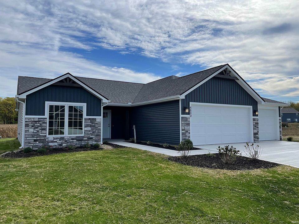 Currently our most popular floor plan with added custom touches throughout. This Acacia floor plan includes Granite countertops in the kitchen, 10' ceilings in the main living, double vanity in the master, and gas fireplace with stone surround + custom, board & batten raised hearth. The 9 x 12 rear covered porch offers a peaceful east facing view with morning sunrises and shaded, evening lounging. Forget "builder basic", we have taken personalization to the next step for this price range - Custom accent wall in the guest bath, warm paint color in both bathrooms, Board & Batten coat wall in laundry, Shaw Luxury vinyl plank with signature Armourbead wear layer & acoustical backing in the hallways, great room, + main living, and matte black lighting/plumbing/hardware throughout. The list price you see also INCLUDES a number of items not frequently found in this price range of home - Finished (drywall, paint, trim, and insulated) 3-Car Garage, Soft close cabinet doors/drawers in the kitchen, Smart Garage Door openers on the steel, insulated overhead garage doors, and Andersen casement windows. The Silverstone subdivision located minutes from schools, shopping, Huntertown Gardens, Country Heritage Winery, and all the amenities northwest Allen County has to offer. List price also includes glass-top electric range, dishwasher, & Microhood, 12 shrub/perennial landscaper's package, and graded/seeded/strawed lawn.